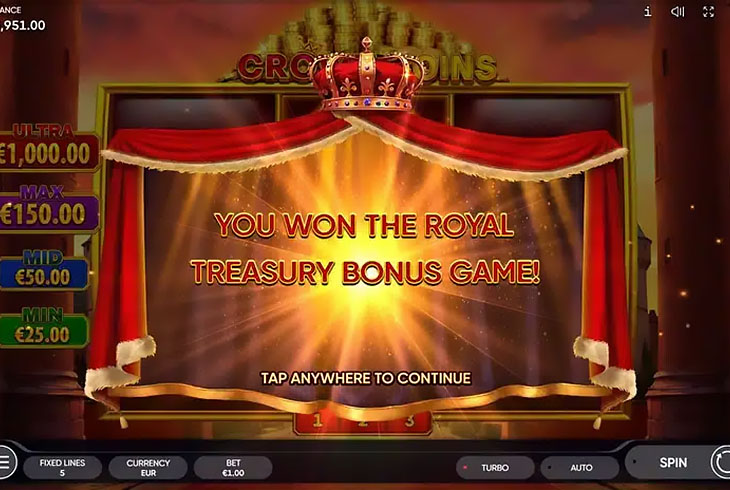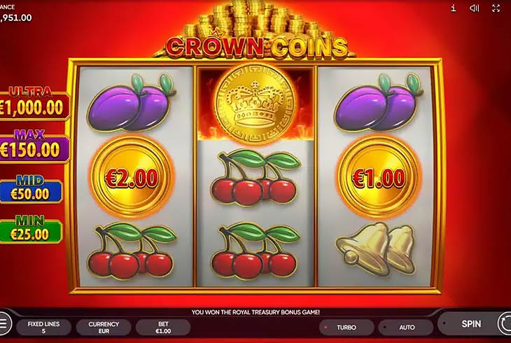 Trzon pakietu funkcji w Endorphina Crown Coins stanowi Royal Treasury Bonus w mechanice hold and win, gdzie każda moneta pozostaje na planszy do końca sekwencji i powiększa łączną wartość. Royal Coin działa jak kolekcjoner pobliskich wartości i jest głównym akceleratorem wyniku, kiedy na planszy leży wiele monet. Lucky Time Feature potrafi dorzucić dodatkowy impuls do wejścia lub wzmocnić dynamikę rundy, a Classic Risk Game po zakończeniu sekwencji daje szansę na kontrolowane podwojenie wygranej.