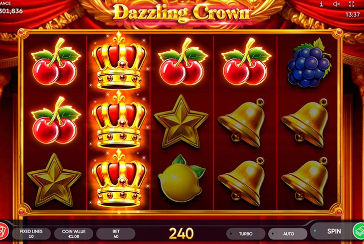 Dazzling Crown to klasyczna owocówka - prosta, szybka i czytelna, ale bez rozbudowanych rund bonusowych.
