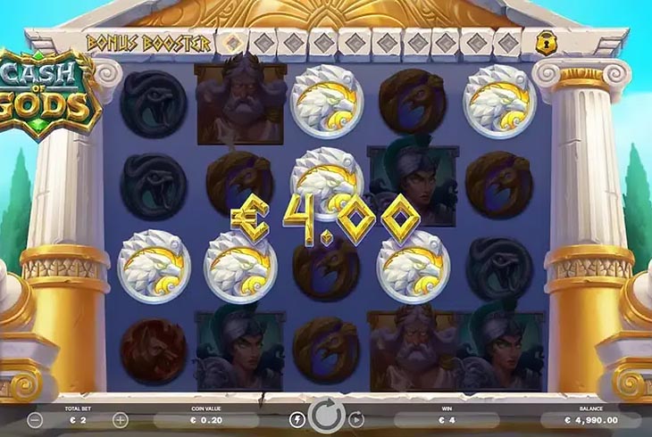 Cash of Gods ma RTP na poziomie 96,5%, wysoką zmienność i maksymalną wygraną do 200x stawki.