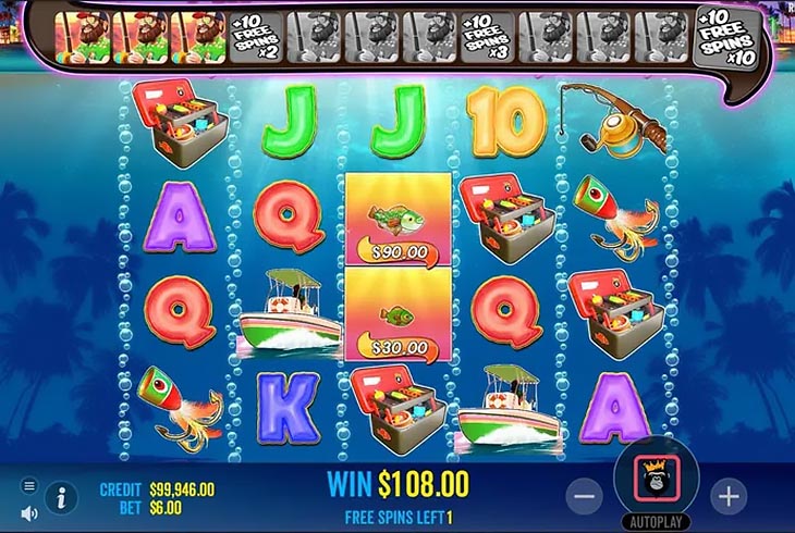 Wild Wędkarz - w rundzie darmowych spinów zbiera wszystkie wartości ryb. Każde cztery symbole Wild zwiększają mnożnik wygranych;